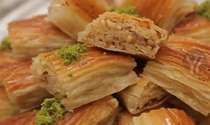 Gazete baklavası, adını yapımında kullanılan ince yufkaların üst üste dizilmesinden alır. Şerbeti tam çeken katmanları ve üzerindeki tereyağı aromasıyla tam bir bayram klasiği!